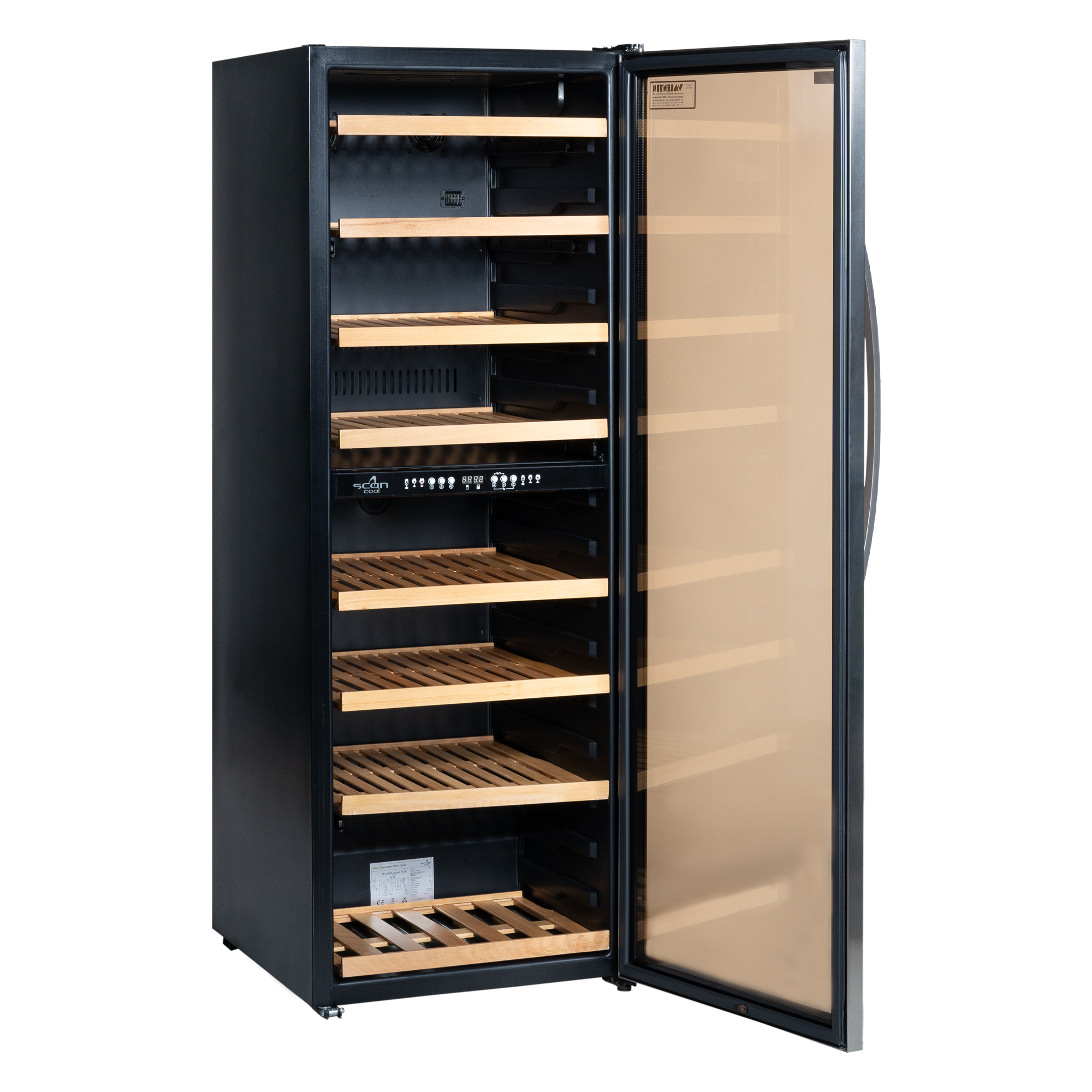 Weinklimaschrank, 420-l, 2-Klimazonen, Temperatur +5 bis +22°C, 6 Holzroste, LED-Beleuchtung blau, Rauchglas-Tür, Korpus schwarz,